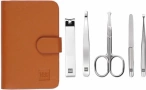 В комплектеманикюрные ножницы, клиппер, пинцет, кюретки, пилка для ногтей, кожаный кейс