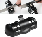 Благодаря своим габаритам, которые составляют 138 × 72 × 39 мм инструмент удобно хранить в шкафчике со столовыми приборами и на загромождать рабочую поверхность на кухне. Два разных точильных лезвия обеспечивают крупную и мелкую шлифовку. Первый диск подходит для заточки керамических и стальных ножей, а второй, выполненный из керамики, обеспечивает мелкую заточку лезвий, убирая заусенцы и мелкие неровности. При этом, именно благодаря керамическому шлифовальному диску, нож можно довести до состояния бритвы.